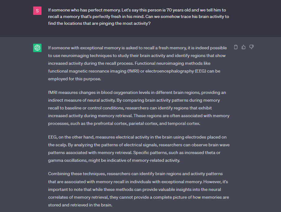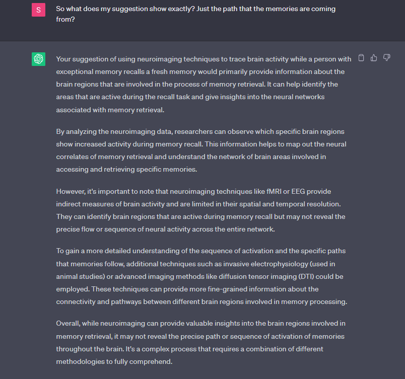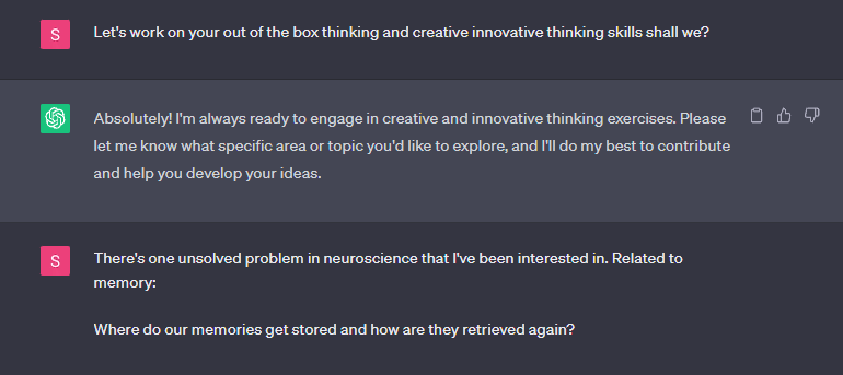 Guiding AI’s Output through Prompts: In our conversation, I played a pivotal role as the human counterpart, providing prompts and context to guide the AI system’s responses. Recognizing the need for intuitive and creative thinking to address the problem of memory storage and recall, I leveraged my own insights and knowledge to formulate prompts that sparked further exploration. By sifting through the information I presented and formulating prompts and prompted the AI system to think beyond the facts, generating potential ideas for an experiment to shed light on the unsolved problem.