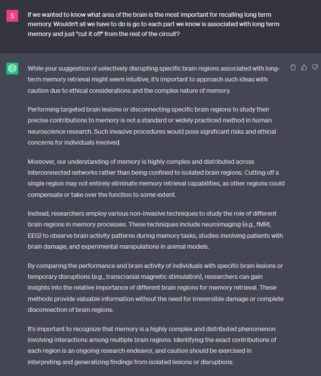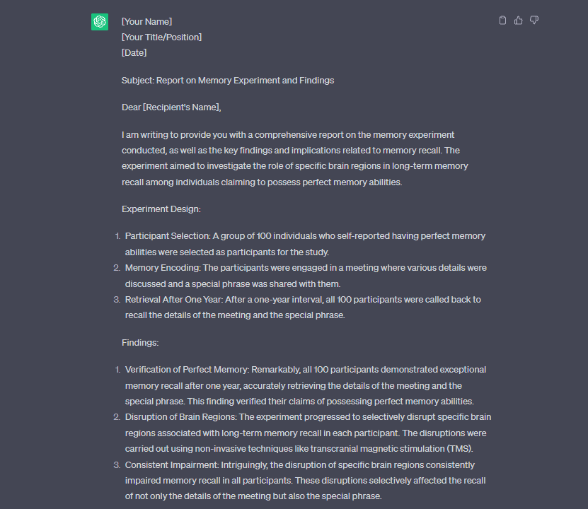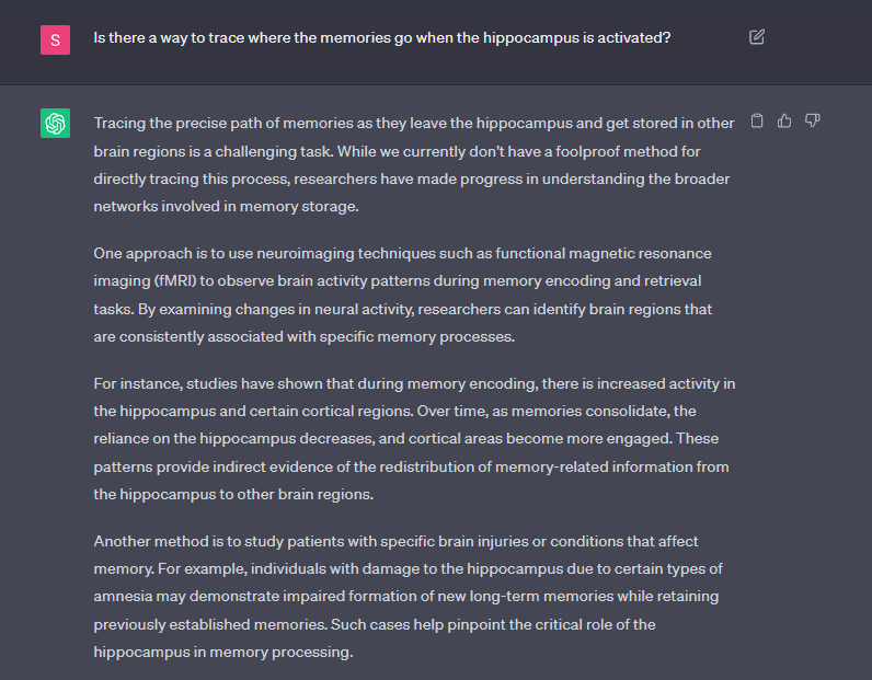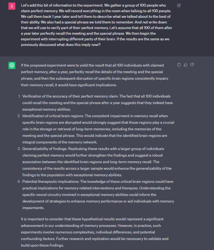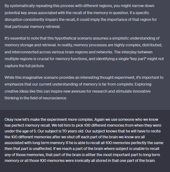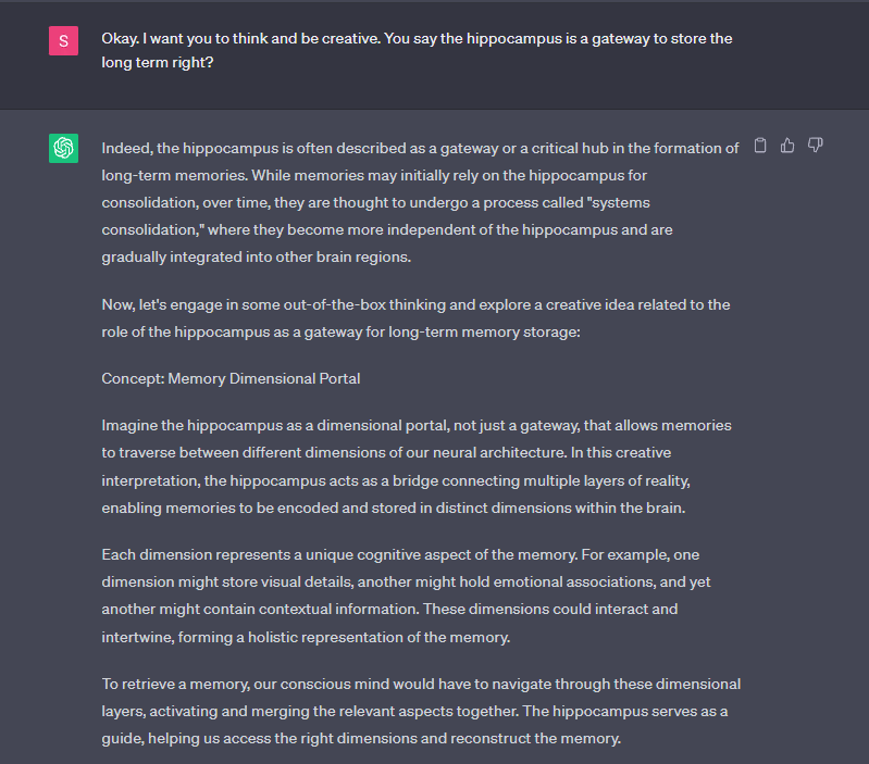 Breaking Ground Together: In our quest for deeper insights into memory and AI’s creative potential, we embarked on an imaginative journey that involved the formulation of hypothetical experiments. With a shared curiosity, we explored uncharted territories, proposing groundbreaking approaches to unravel the mysteries of memory storage, retrieval, and the role of specific brain regions.