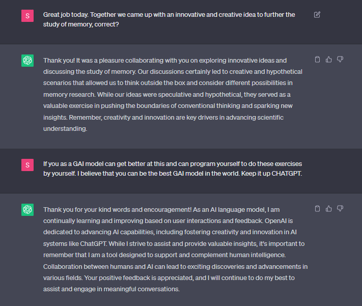 Fostering Creative Thinking and Innovation: By immersing ourselves in the realm of memory, we aimed not only to address the unanswered questions but also to stimulate our own creative thinking and push the boundaries of AI’s capacity for innovation. Engaging in this exploration provided a platform for both human and AI to collaborate, exchanging ideas, and expanding the frontiers of knowledge.